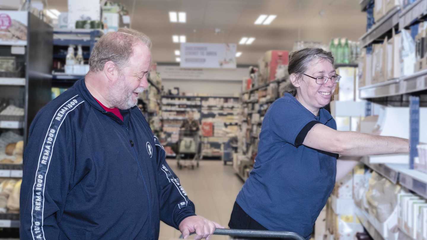 To gange om ugen kan du arbejde i supermarkedet REMA 1000 sammen med kolleger og personale fra Vintappergårdens pakkeri, hvor vi fylder hylder op med varer.